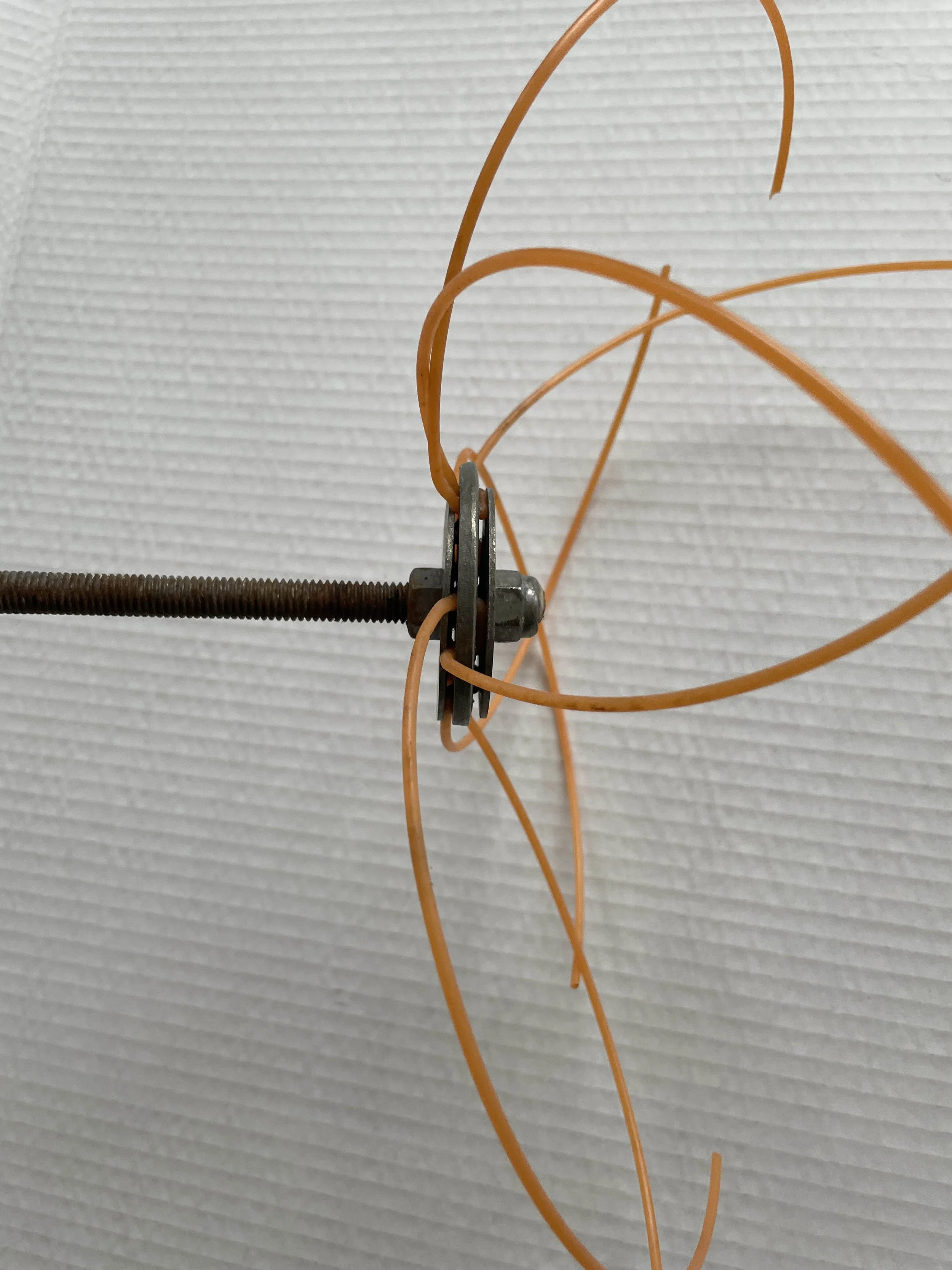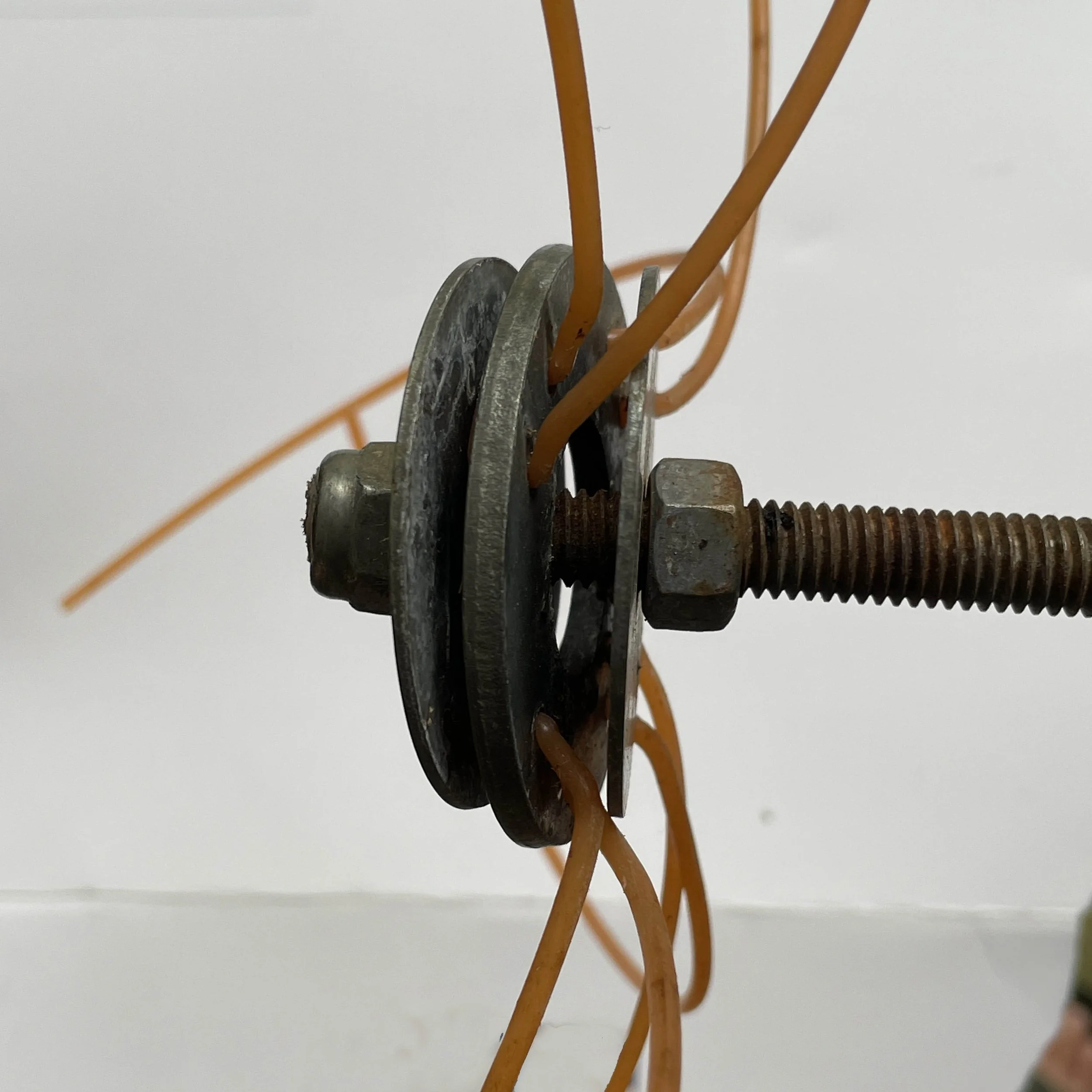 With one lock nut at the bottom end of the rod, tighten the other nut towards it, sandwiching the washers together. As you tighten, ensure that the weed whacker strings are evenly spaced and pointing away from the rod. I find it easiest to hold the rod with vice grips and tighten the nut with a wrench.