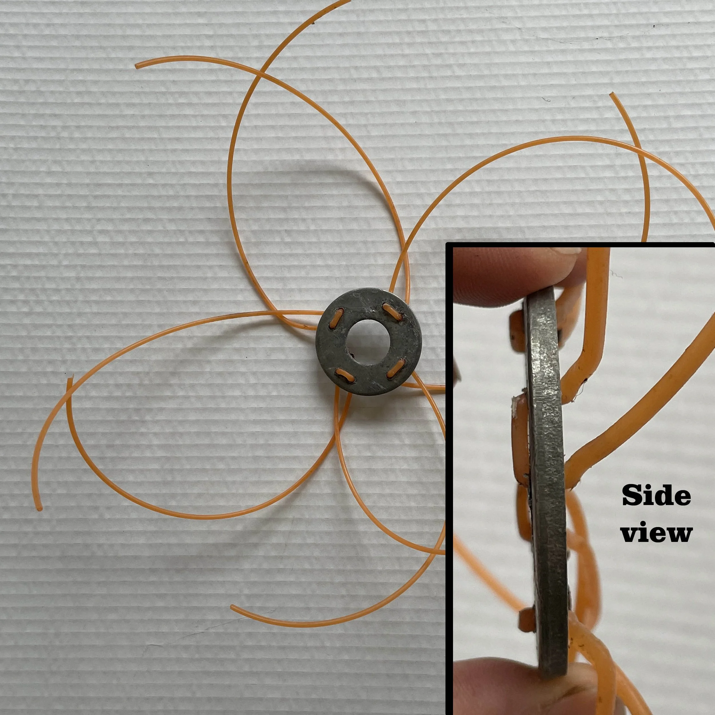Fold your weed whacker string pieces in half and poke the ends through the holes you drilled in the heavy washer.