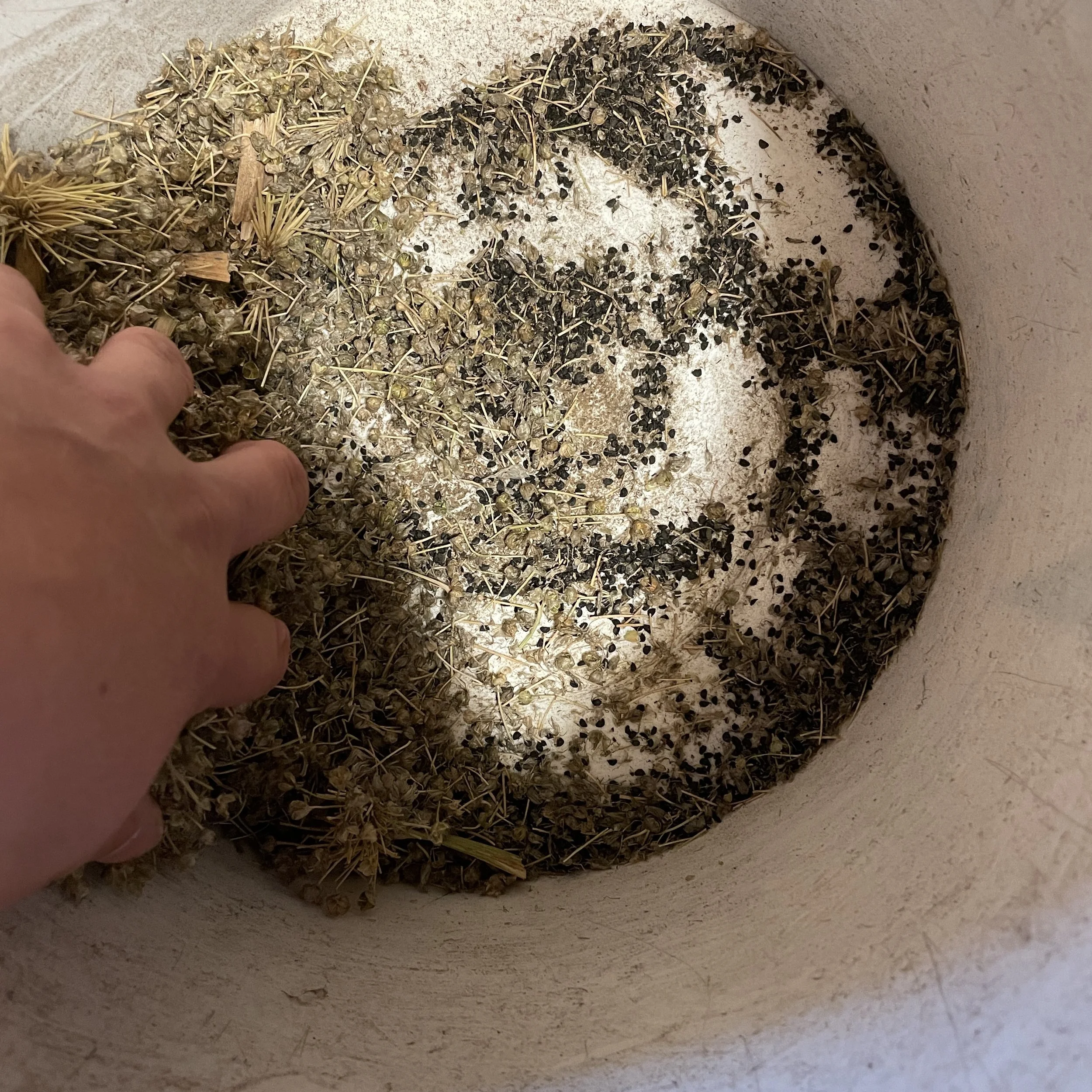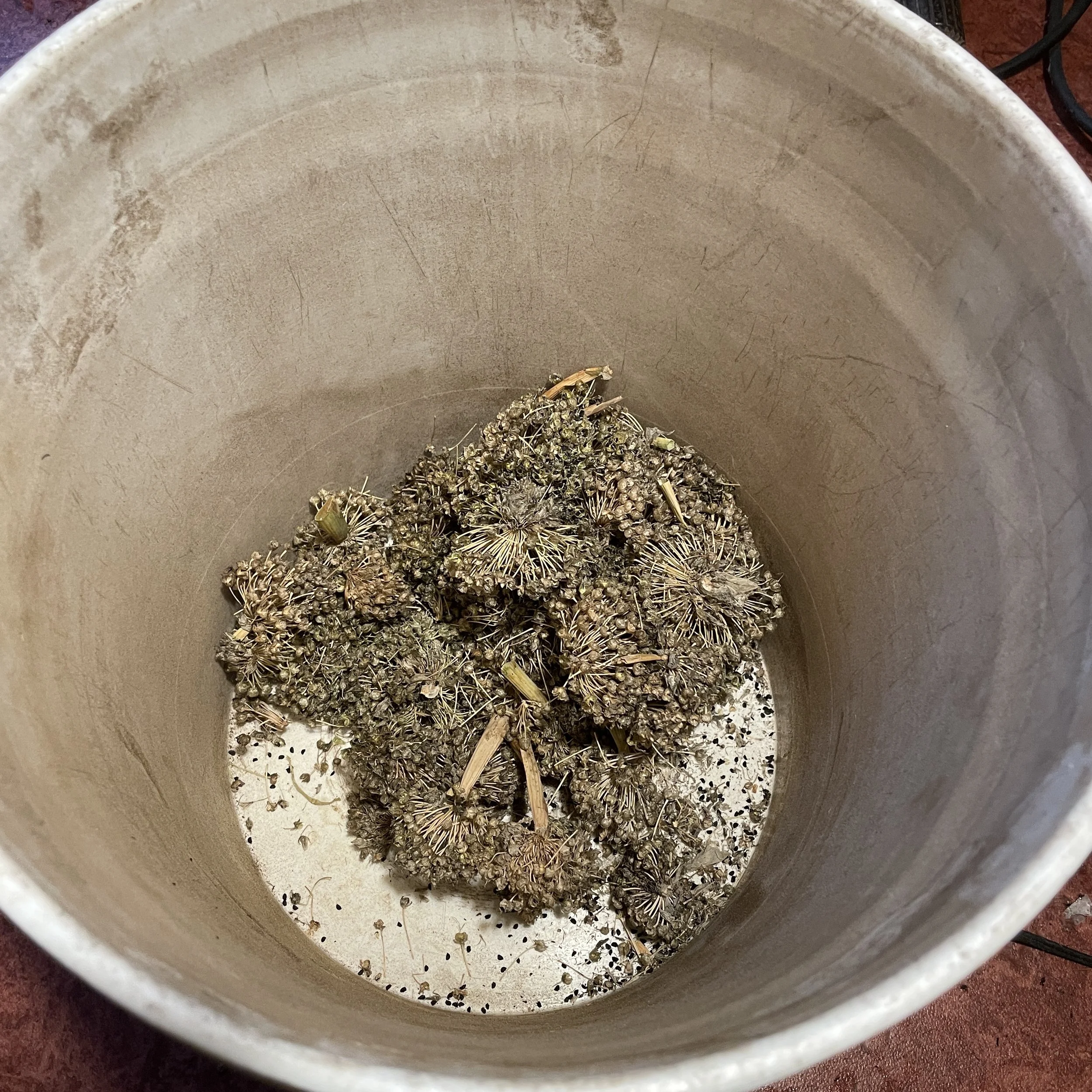 Place unthreshed seeds in the bucket. If they are attached to a lot of plant material, you may want to hand pick the pods/capsules off, or run them through a ½” screen.