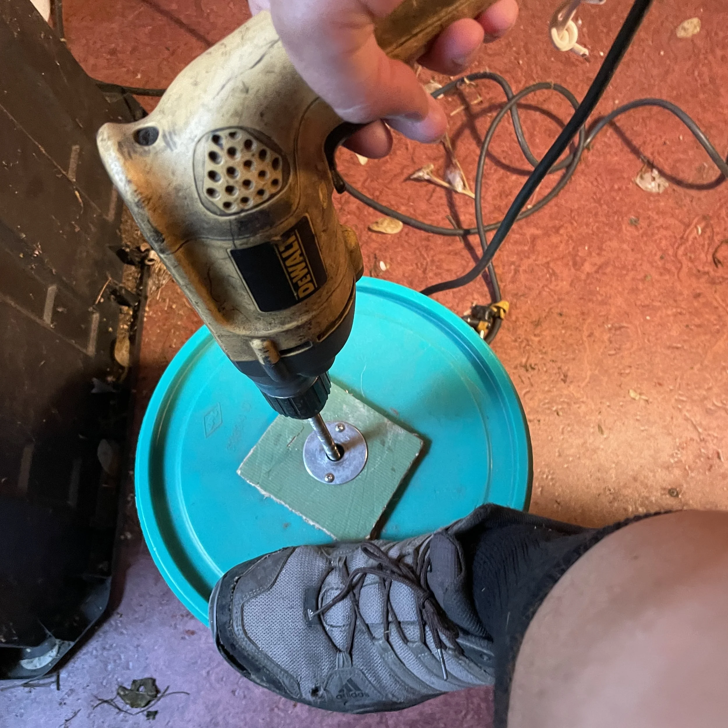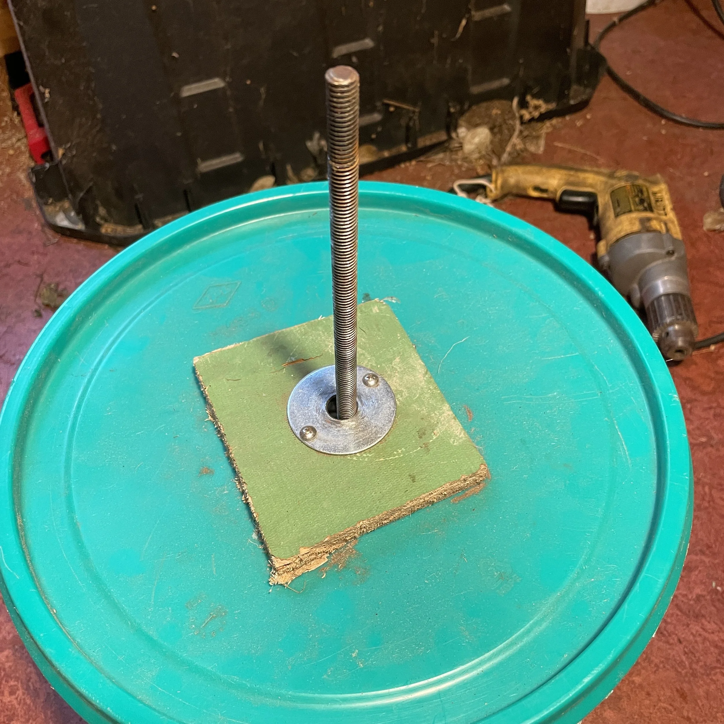 Drill a hole in the center of the bucket lid, big enough for the threaded rod to go in and out easily. This hole will get pretty chewed up with regular use, but you can easily reinforce it by drilling another hole in a scrap of plywood and affixing it to the lid with short screws. You can add an additional washer to make it even more durable.